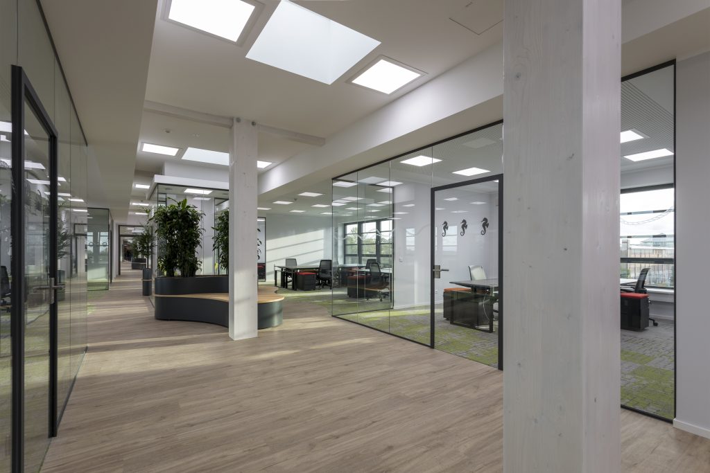 Aus statischen und aus Nachhaltigkeitsgründen haben wir die tragende Konstruktion in Holzrahmenbauweise ausgeführt, die vorhandene Struktur wurde in Holzrahmen mit Mittelstützen übersetzt. Die innere Struktur des Bürogebäudes sollte ein abwechslungsreiches Spiel zwischen offenen und geschlossenen Räumen ergeben. Eine kleine Sitztreppenanlage bildet einen fließenden Übergang zwischen Hauptgeschoss und Turmgeschoss, in dem sich Besprechungsraum und Küche befinden. Die luftige Atmosphäre der Geschosse wird durch den großartigen Blick auf Kiel unterstrichen.“